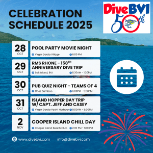 It’s party time tonight as we celebrate 50 years of Dive BVI! We’ll have music, food and drinks, and a beautiful sunset as we reminisce on our past 50 years of operations in the British Virgin Islands. No long winded speeches here – this is a party!